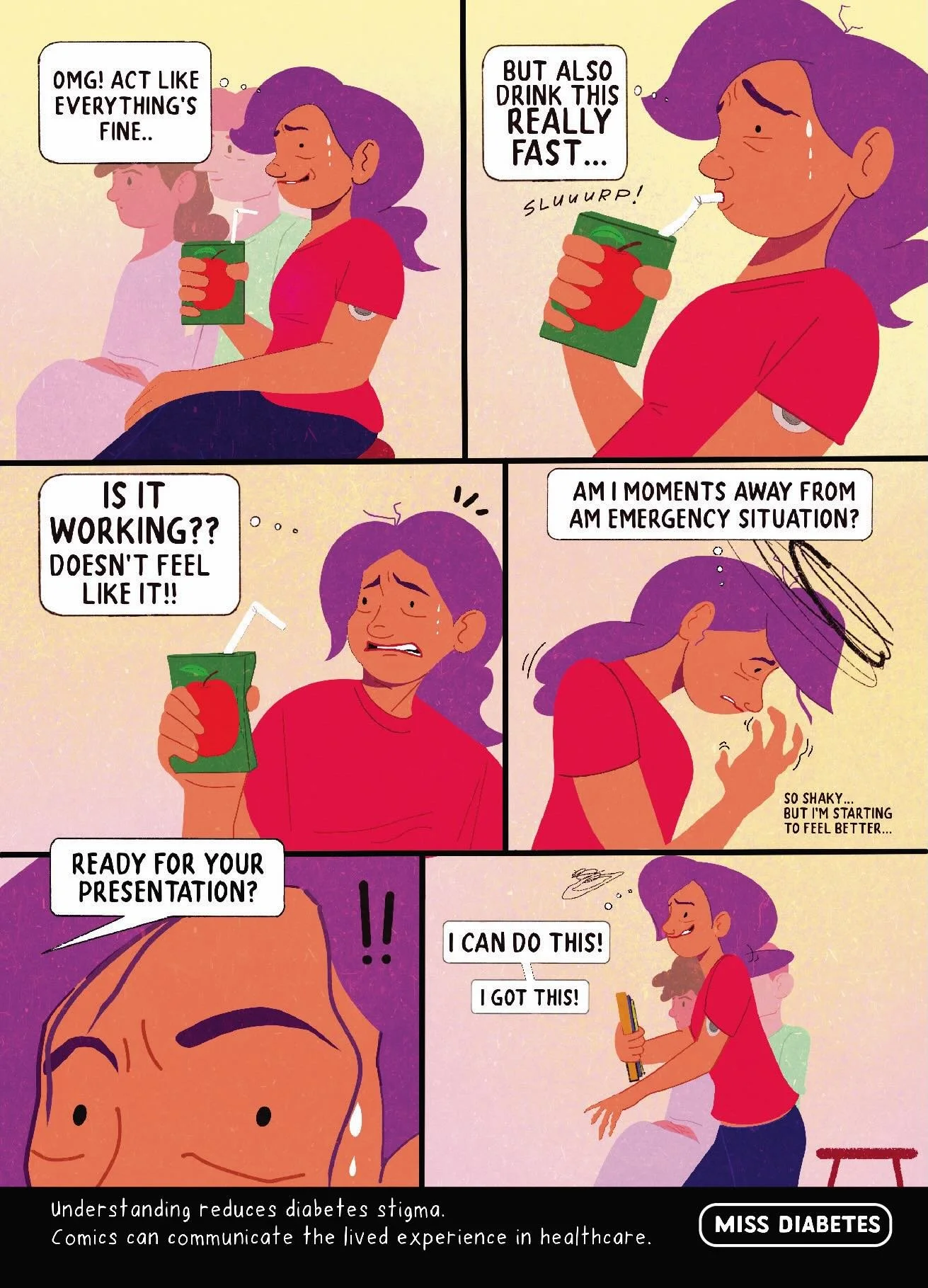 Through comics, I explore the lived experience of type 1 diabetes, and how they can reduce diabetes stigma in healthcare and society.